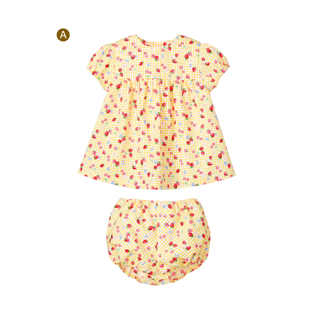 袖口にゴムを通した小さなパフスリーブに、ヨーク切り替えからふんわりギャザーが広がるワンピースと、共布をバイアス裁ちにしたブルマーのラブリーなセットアップ。