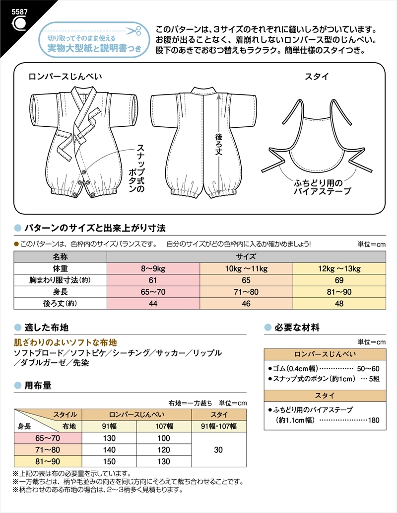 | 商品説明 | タイプ:ベビー男女(身長65-90cm) お祭りや花火大会などのイベントはもちろん、普段着にも大活躍! お腹が出ることなく、着崩れしにくいロンパース型だから、寝苦しい夜のパジャマにもおすすめ! 股下のあきでおむつ替えもラクラク。 2枚仕立てで簡単仕様のスタイ(よだれかけ)つき。 3サイズ縫いしろつきパターン。 適した布地:肌ざわりのよいソフトな布地。 (ソフトブロード/ソフトピケ/シーチング/サッカー/リップル/ダブルガーゼ/先染) |