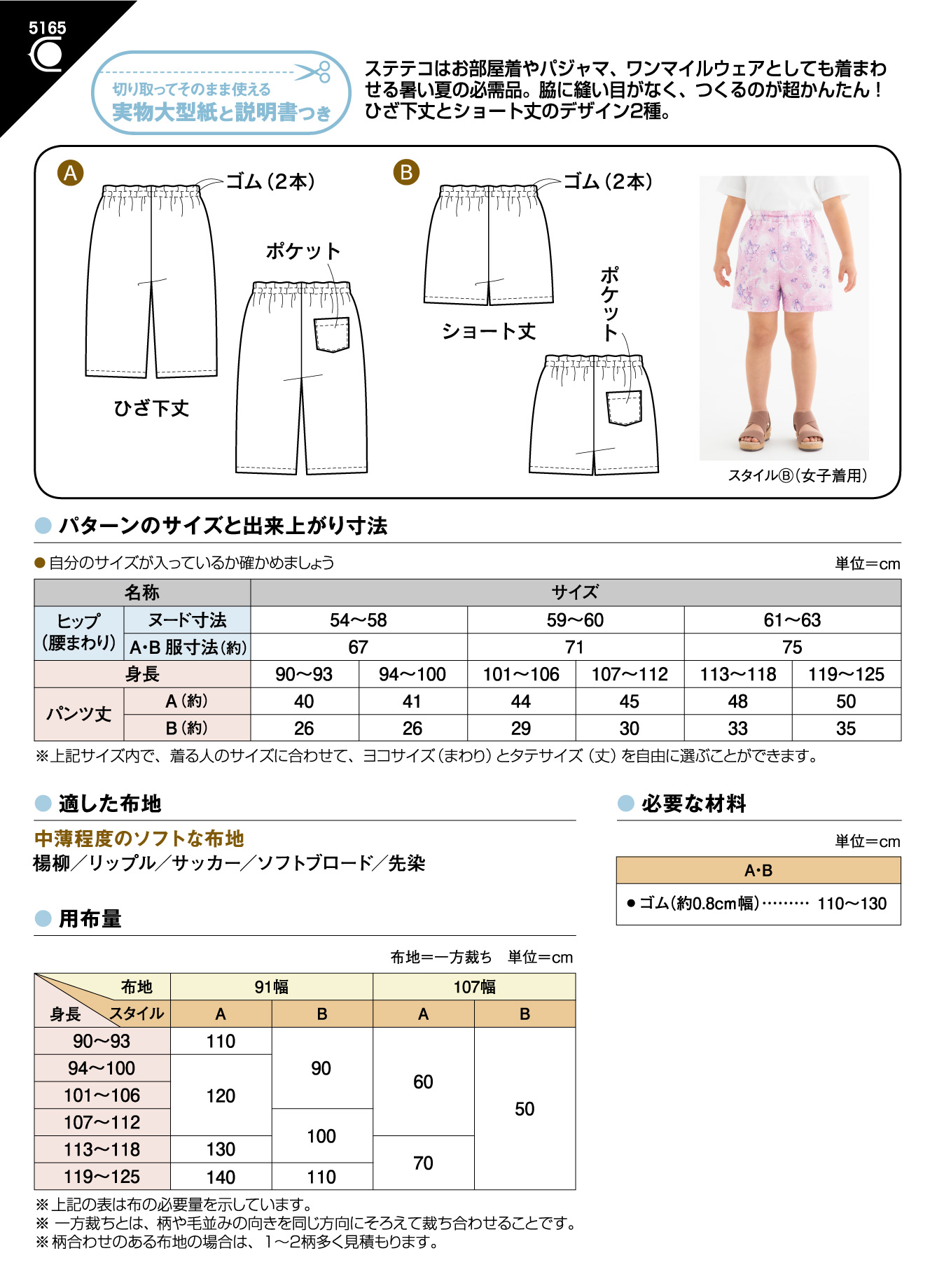 | 商品説明 | タイプ:こども男女(身長90~125cm) ステテコは、部屋着やパジャマ、ワンマイルウエアとしても着まわせ、暑い夏に大活躍。 すとんと落ちるストレートシルエットで脇に縫い目がなく、ウエストがゴム仕様なのでつくるのが超かんたん!手づくり初心者さんにもおすすめ。 リップルやサッカー、楊柳など肌ざわりの良い布地で何枚でも作りたくなる、汗を沢山かく季節の定番商品です。 Aはひざ下丈、Bはショート丈の着丈2種。 適した布地 |