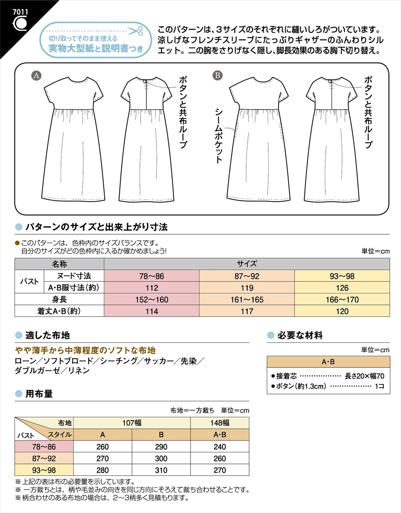 | 商品説明 | タイプ:レディ(身長152-170cm、バスト78-98cm) 脚長効果のある高い位置の切り替えからたっぷり入ったギャザーが風を通すゆとりになり、涼しく着られるロングワンピース。 初心者さんにもつくりやすい身頃続きのフレンチスリーブが、気になる二の腕をカバーします。 1 枚でおうち着からリゾート着まで幅広いシーンで活躍! B は脇の縫い目利用のポケットつき。3サイズ縫いしろつきパターン。 適した布地:やや薄手から中薄程度のソフトな布地 (ローン/ソフトブロード/ シーチング/ サッカー/先染/ダブルガーゼ/ リネン) |