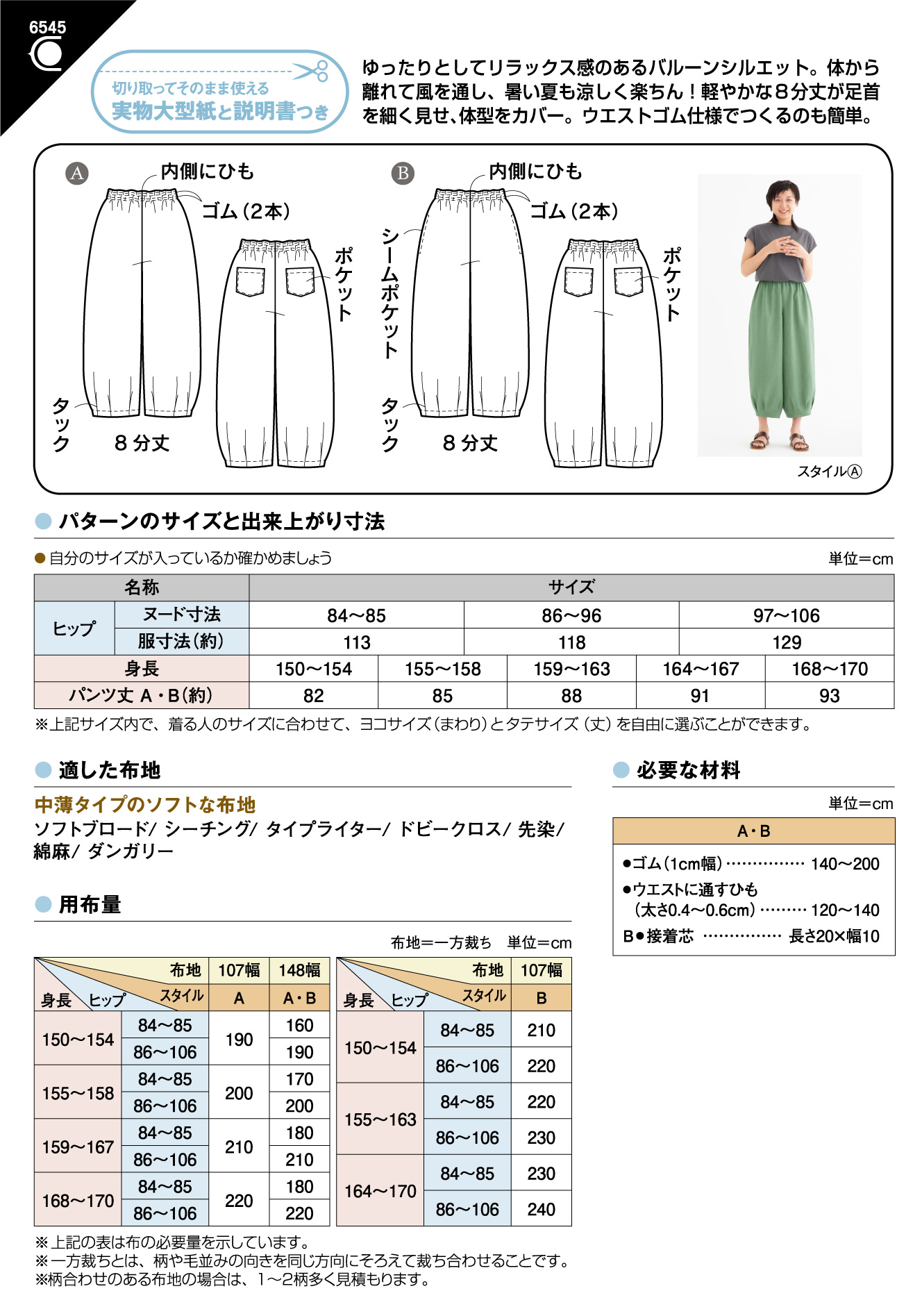 | 商品説明 | タイプ:レディ(身長150-170cm、ヒップ84-106cm) ゆったりとしたワイドシルエットでリラックス感とトレンド感を兼ね備えたパンツ。 体から離れて風を通してくれるので、暑い夏も涼しく楽ちん!体型カバーも叶います。 裾にあるタックで立体感のあるシルエットをつくり、8分丈で足元をすっきり見せ、バランスよく軽やかな仕上がりに。 ウエストはベルトなしのゴム仕様で楽に履け、腰まわりに優しくフィット。 内側に通したひもでサイズ調整も可能です。 Aは後ろポケットつきで簡単仕様の初心者向け、Bは後ろポケットと脇にシームポケットつき。 適した布地 |