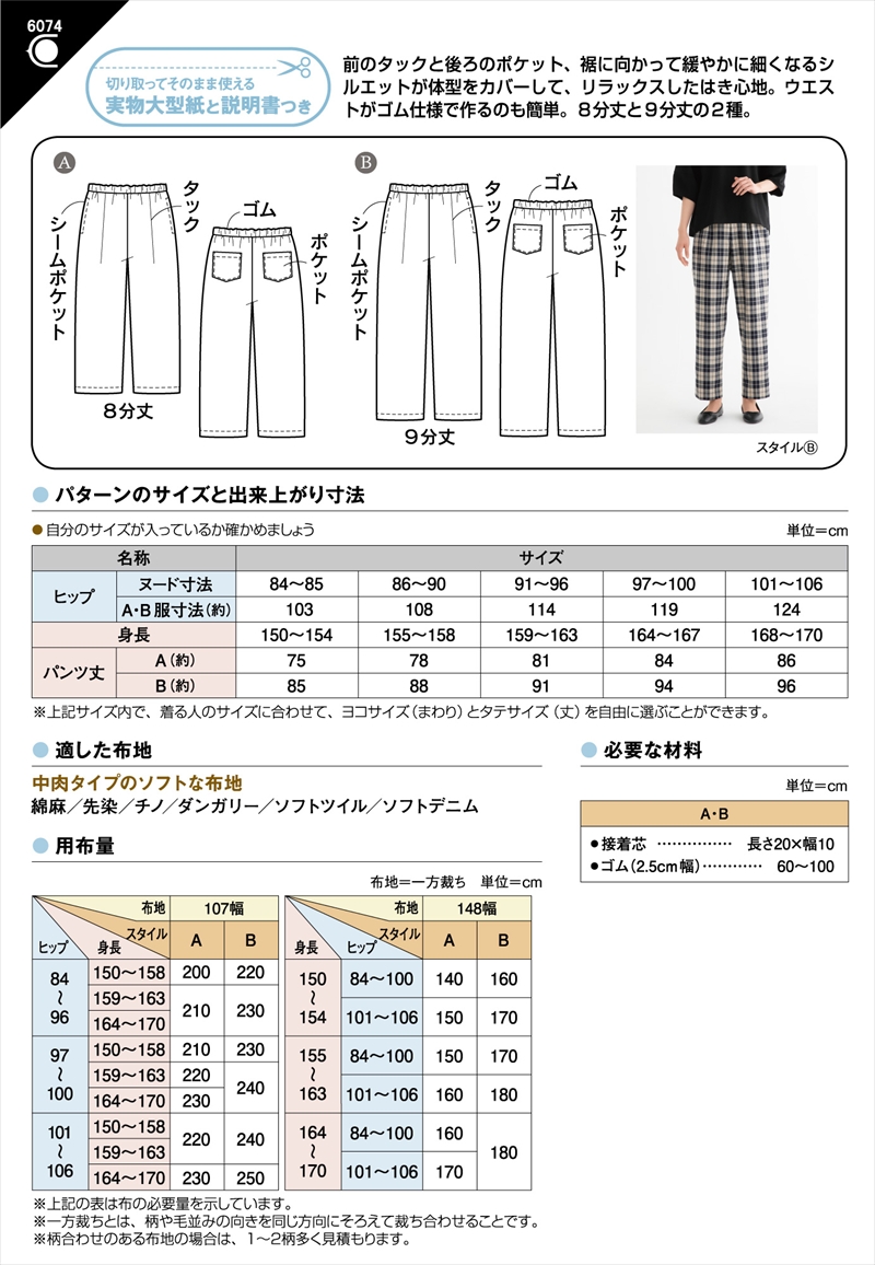 | 商品説明 | タイプ:レディ(身長150-170cm、ヒップ84-106cm) ゆとりのあるヒップまわりとタックでお腹の高さをカバーしたウエストゴムのパンツ。 裾に向かってなだらかに細くなるシルエットですっきりとした印象に。 脇縫い目利用のポケットつき。 A足捌きのよい8分丈。Bシューズとのバランスも取りやすい9分丈。 適した布地:中肉程度のソフトな布地 (綿麻/先染/チノ/ダンガリー/ソフトツイル/ソフトデニム) |