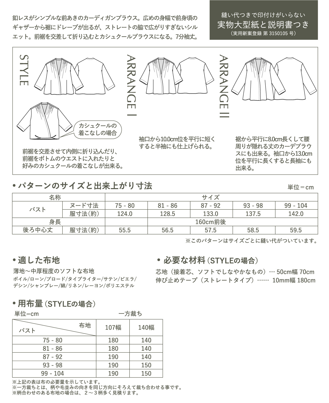 アレンジⅠは袖丈を半袖に、アレンジⅡは長袖にして、裾を腰周りが隠れる丈まで長くしてカーデブラウスにもできる。