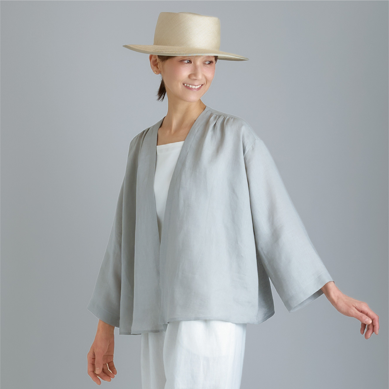 広めの身幅で前身頃のギャザーから裾にドレープが出るが、ストレートの脇で広がりすぎないシルエット。
