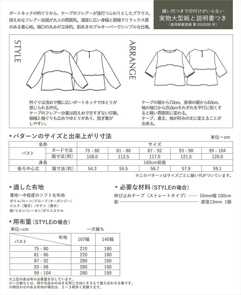 | 商品説明 | タイプ:大人(身長160cm前後、バスト75-104cm) ボートネックの衿ぐりからフレアーが波打つケープが特徴のブラウス。 控えめなフレアー加減が甘すぎない大人の雰囲気。 適度に広い身幅と肩幅でリラックス感のある着心地。 袖幅と袖ぐりにゆとりがあり、脱ぎ着しやすく、袖口の丸みが立体的な長袖。後ろ中心で釦ループ留めのシンプルな仕様。 適した布地:薄地~中薄程度のソフトな布地 (ボイル/ローン/ブロード/オーガンジー/ビエラ(薄手)/サテン(薄手)/綿/リネン/レーヨン/ポリエステル) |